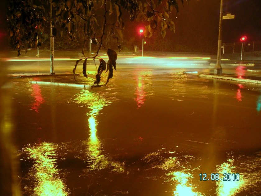 It rained this evening. It didn’t seem that bad, actually, umbrella weather not hide-inside-for-40-days-and-nights weather. But then, coming home from an evening out, we encountered the Flood.
