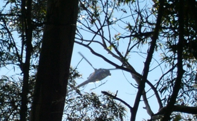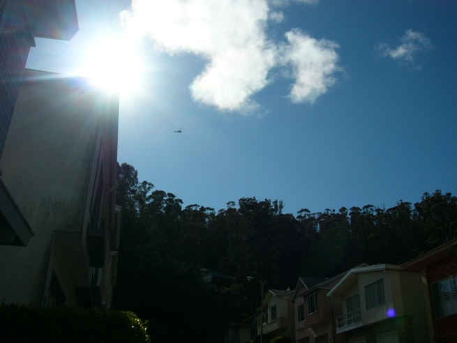 It was the helicopter that caught our eye. Elegant as a dragon-fly, gleaming in the evening sunlight between two fat white clouds in the blueness of the sky, it hovered. It was going nowhere, and as we neared home, it seemed to be over Mount Sutro Forest. I jumped out of the car, and took some photographs, not easy because it was into the sun, which at 5.15 p.m. was still quite high.