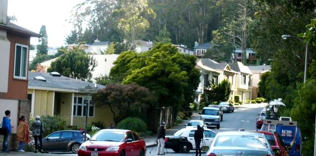 It turned out I was barking up the wrong trees. The cause of all the commotion was right back here, in Forest Knolls. The first block of Christopher was blocked by an SFPD car, yellow tape, and a couple of news reporters with cameras.