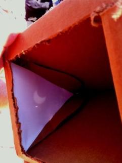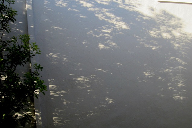 Nevertheless, yesterday’s solar eclipse was exciting. The 84% maximum changed the quality of the light, and the leaf-shadows on the wall became attenuated crescents. We watched the eclipse through pinhole images thrown on the wall.
