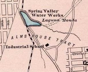 The map from 1897 shows two creeks flowing into Laguna Honda Reservoir. (The grids of streets shown on the map were never laid out). The upper creek is likely the one the author heard “tumbling over rocks”.