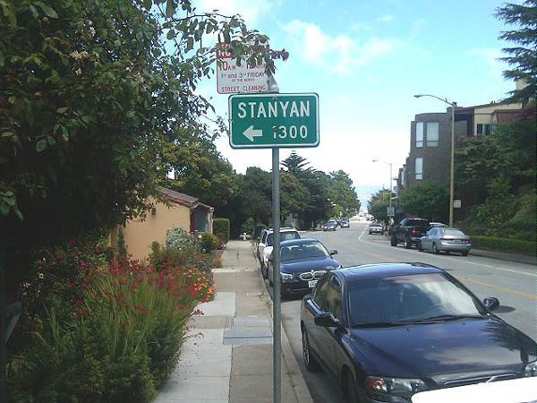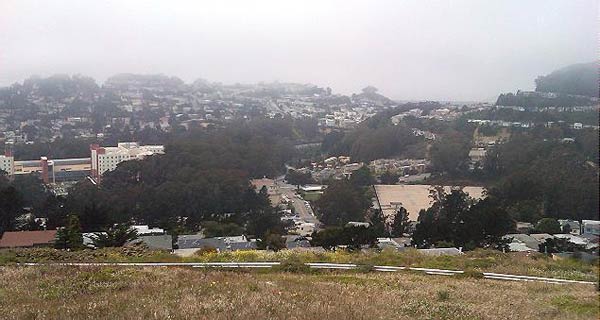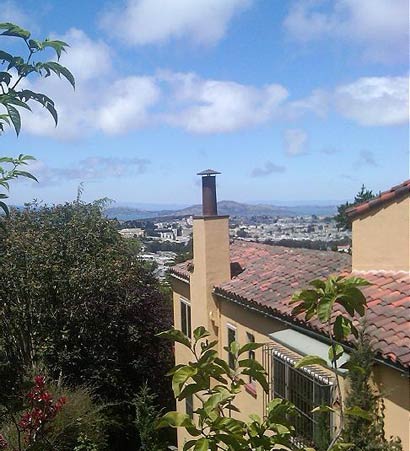 At about this location, the author turned back to look over the city. The Panhandle of Golden Gate Park is visible at the roofline of the house.