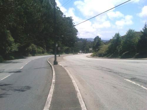 Present day Clarendon Avenue. The spot is where the road “descends into a canyon”. Mt. Sutro (not visible in the photo) is to the right and the peak upon which Sutro Tower sits is to the left. It was just beyond this location where the author said, “one might as well be in the depths of the Sierras”.