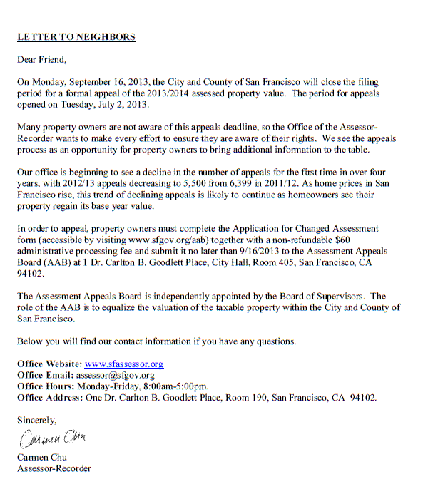 We received this letter from the office of Assessor Carmen Chu, with a request to publicize it. Homeowners who want to appeal the 2013-2014 of their property have until September 16th to do so.