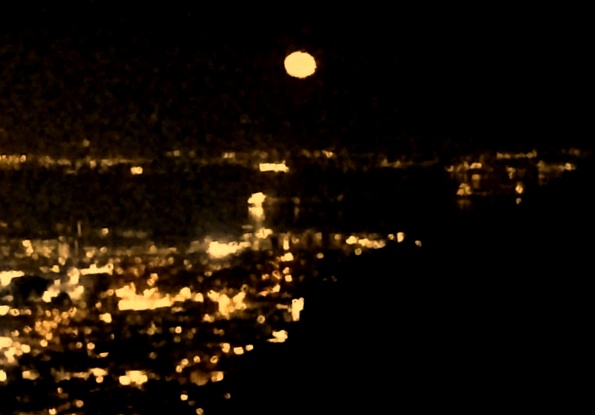 I tried to adjust the color in the picture below, but that didn’t work either: it made the whole picture reddish. Still, it has a painterly look I rather like, even if it doesn’t look like the moonrise I saw.