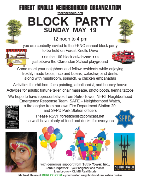 It’s on Sunday May 19th 2018, from 12 noon to 4 p.m. and will be held in the 100 block cul-de-sac of Forest Knolls Drive (that’s just above the Clarendon School playground.) There’ll be snacks (tacos, empanadas) and drinks, a bouncy house, balloons, a fortune teller and a photo booth and more. Representatives from SAFE – Neighborhood Watch, the NERT Neighborhood Emergency Response Team, and from the Fire Station and SFPD may be present. Please RSVP to Walter Caplan at forestknolls@comcast.net