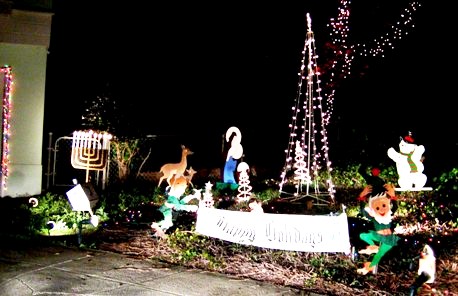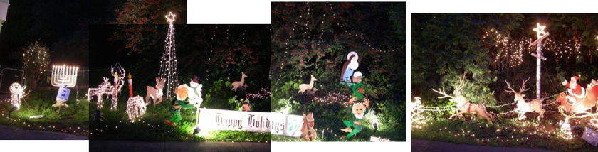 At the end of the road, there’s the north pole, Santa, reindeer, a menorah, and a sign saying Happy Holidays!