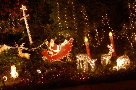 Just off Dellbrook, in a cul-de-sac called Greenview, the residents co-operate each year to set up an exuberantly decorated space. This year is no different. A string of colored lights across the road defines the area, and a sign says “Santa’s Court.”