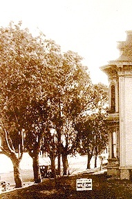 “The prettiest portion of the whole road is just beyond the Almshouse gate. It might properly be named the Eucalyptus road, for both sides of the driveway are lined with the most picturesque specimens of those artistic trees. The trees are just in their prime and make a most refreshing shade, that is pleasant to look at in cool weather and cooling when the sun is hot. This avenue is about 500 feet long, and in some places the branches of the trees meet overhead, forming a natural archway, the equal of any in the State. When the sun is low in the west and the trunks of the trees cast long shadows over the roadway, then is it indeed a beautiful sight. The spots of light dance as if endowed with life, and the whole interior of the archway is filled with a soft glow that mingles with the quivering sunshine.