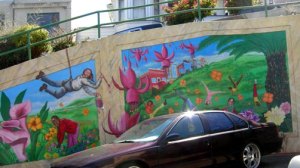 The tour ended at Quesada and 3rd street in Bayview Hunter’s Point, where the community saved a line of 13 Canary Island Palms in the median, planted around 1932. The city apparently wanted to fell them in the 1970s, because they needed too much maintenance. A few years later, neighbors started Quesada Gardens along the length of the median, and then added a mural at a cul-de-sac at the street’s end.