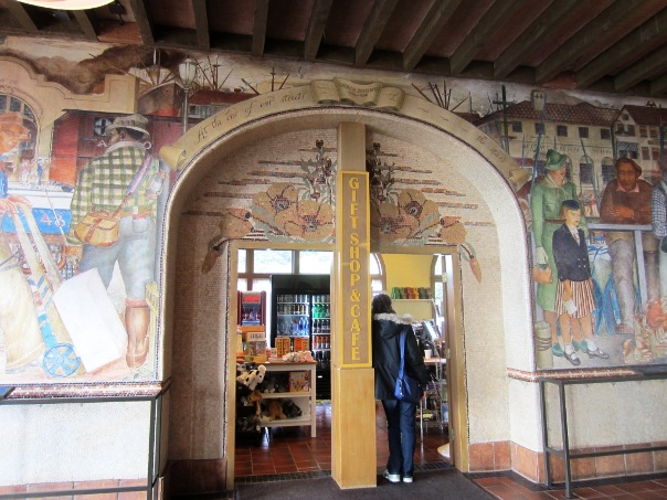 At the Beach Chalet, we discovered something new: a gift shop that has coffee. And snacks like cookies and crackers and chips. It’s nice to have something handy to the beach. This is at ground level, perfect to drop in on after looking at the murals and the amazing carved balustrade of the staircase up to the restaurant.