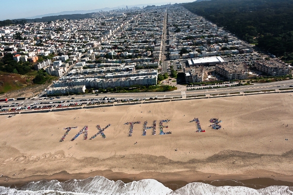 She looked out at the beach. “The last time I was here,” she said, “we were making a big sign saying TAX THE 1%. It was amazing.” She waved in the direction of the sea. “They took pictures from the air. There were hundreds of us.”