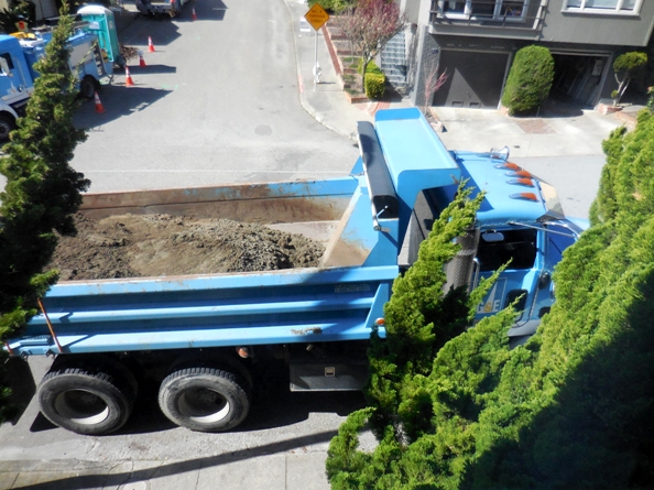The truck in front of my house tipped up, and the earthmover grabbed the soil. I presume they filled in the hole they’d dug.