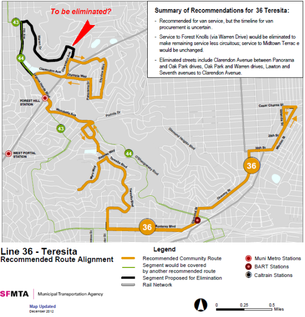 Someone drew my attention to the new SF MTA study released January 23rd. Though the 36 Teresita bus (the only one that comes through our neighborhood) is not mentioned in the actual report, it shows up in the maps. It looks like the plan is to discontinue service to Forest Knolls, and maybe at some point replace it with a van service. The map below is taken from that report. (The whole report is available as a PDF HERE.)
