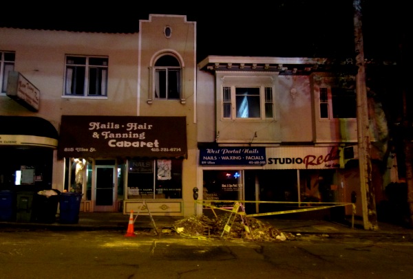 A white van – fire department surveillance of some kind? – sat in front of the West Portal Tunnel entrance. In front of the Studio Redz salon, a sad pile of debris was cordoned off with yellow tape and a traffic cone.