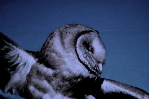 Later, I went back. The owl was there, but difficult to see in the darkness. I heard rustling sounds that suggested it was eating the rodent it had caught. I tried getting photographs, but both my phone and camera rebelled at the darkness. This picture is an edited public domain photograph.