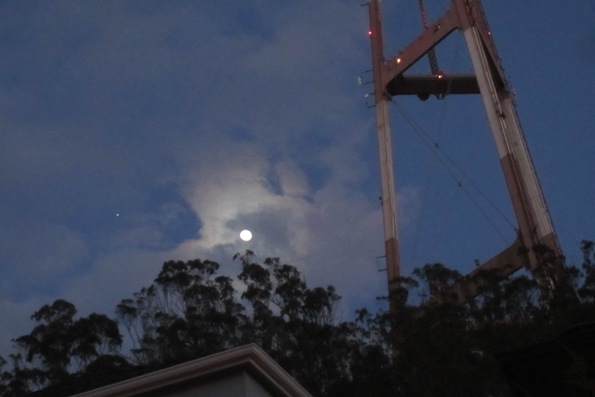 Around midnight, it’s usually quiet in Forest Knolls, the only sounds coming from the house itself. Outside, you might hear the wind soughing in the trees and humming in Sutro Tower. But tonight, a bird chirped tentatively in the backyard. At first I thought it was just a songbird disturbed on its perch, or responding to the bright moon.