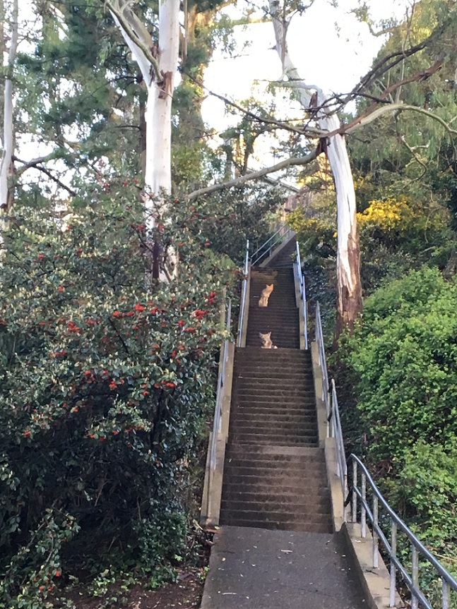 I never got to see its face. When I rolled down the window, it realized I was looking at it, and it decided to move along. In a minute, it scrambled up the hillside into Sutro Forest, and all that was left was a sound of scrabbling in the bushes.