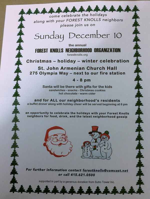 Walter Caplan of the Forest Knolls Neighborhood Organization asked me to post this “save the date” for the Forest Knolls Holiday Party. It’ll be at the Armenian Church at 275 Olympia Way, on Dec 18 at 4 p.m. – with snacks, dinner, Santa, and gifts for children.