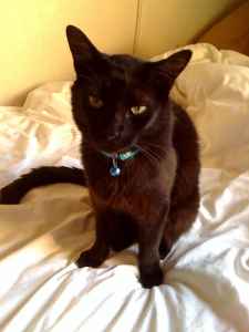 Here’s what the ad on Craigslist says: “Sebastien is a small BLACK 4 year old male CAT with a shy yet loving disposition. He has individual white hairs speckled all throughout his body, and his tail is long and thin and has a BENT TIP (from birth). He has large, pointed ears, light green eyes and a black nose, and was last seen wearing an aqua green soft collar with a blue bell, which he may have lost by now.