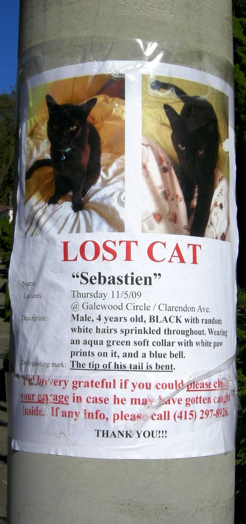 There are “Lost Cat” signs on lamp-posts all along our street. The black cat, Sebastien, seems to have gone missing from Galewood, down below the school on Clarendon on Nov 5, 09.