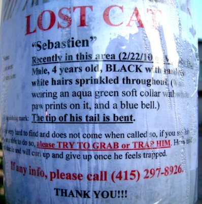 Edited to Add 1: Sebastien is still missing, but was apparently seen on Warren Drive on 22 Feb 2010. He doesn’t come when called, but is docile when captured. If you see him “please try to grab or trap him” and call the owners.