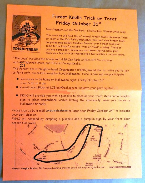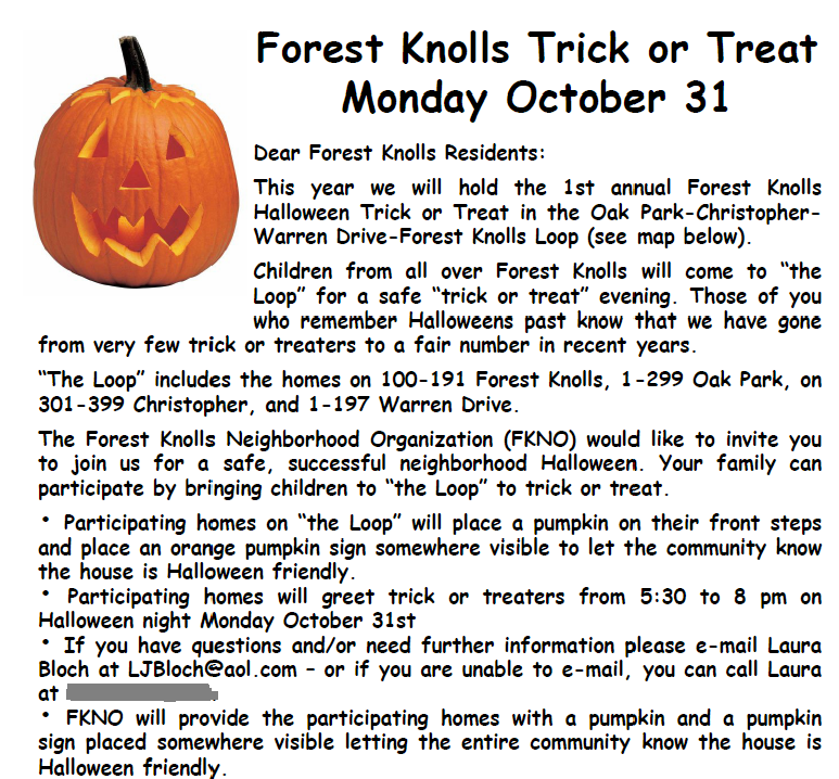 It’s that time of the year again, with the orange flyers in your mailbox, telling you about the Halloween loop. The Forest Knolls Neighborhood Organization does this each year.