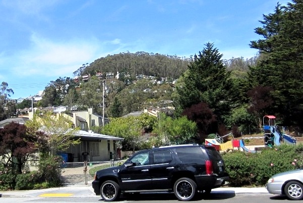 Present day Clarendon Avenue. The spot is where the road “descends into a canyon”. Mt. Sutro (not visible in the photo) is to the right and the peak upon which Sutro Tower sits is to the left. It was just beyond this location where the author said, “one might as well be in the depths of the Sierras”.