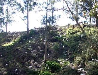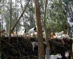Laguna Honda Hospital has hired a herd of goats to clean out the undergrowth in front of its new building, and behind the parking lot (along Clarendon Avenue). In the picture, the white dots are the goats, and you can see a bus parked on top of the hill.