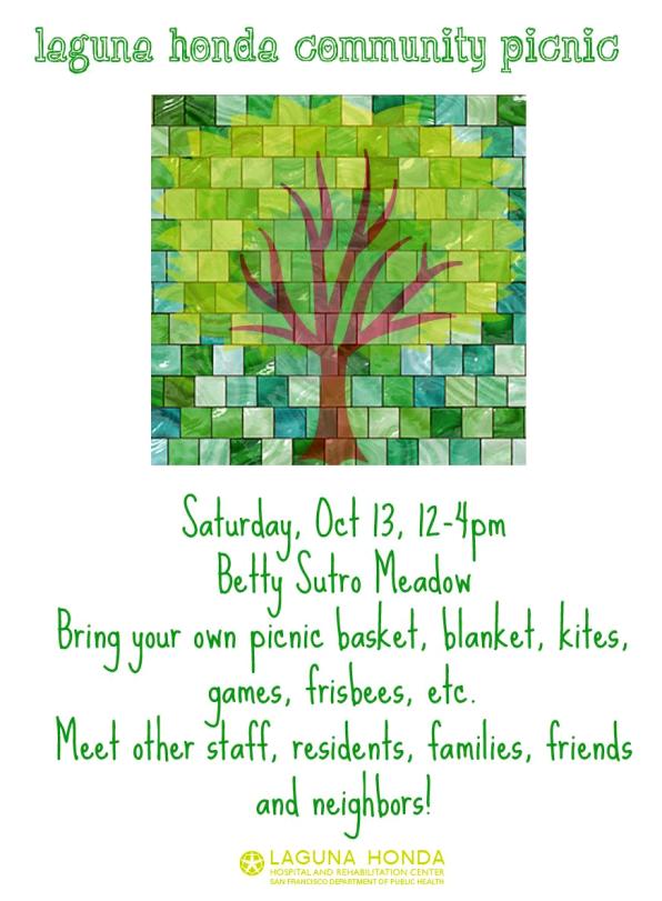 Walter Caplan asked for publicity for this flyer, forwarded by George Wooding of Midtown Terrace. (Walter, thanks for clearing publication permission with Laguna Honda Hospital.) It’s for the Laguna Honda Community picnic, tomorrow 13 Oct 2012, between noon and 4 p.m. at the Betty Sutro meadow. Bring your own food and toys!