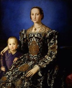 The picture here is a public domain image of Eleanor of Toledo, painted by the artist Angelo Bronzino in 1545. This dress, in white with a bold black and gold pattern, is one that is reproduced in the Pulp Fashion exhibition. An interesting factoid: The dress never apparently existed (though Eleanor did). They gave the artist a bolt of the fabric and asked him to paint it as a gown on his subject.