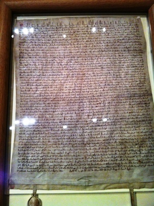 The first document, signed by King John of England is I think lost, but there are 17 surviving versions issued by subsequent kings. The one on display at the Legion of Honor is from the reign of Henry III, and dates back nearly 800 years to 1217. It’s in Latin, in a beautiful hand. I couldn’t read it, but the translation of one para hangs beside it. It gave me goose-bumps to read it. It’s only here until 5 June 2011.