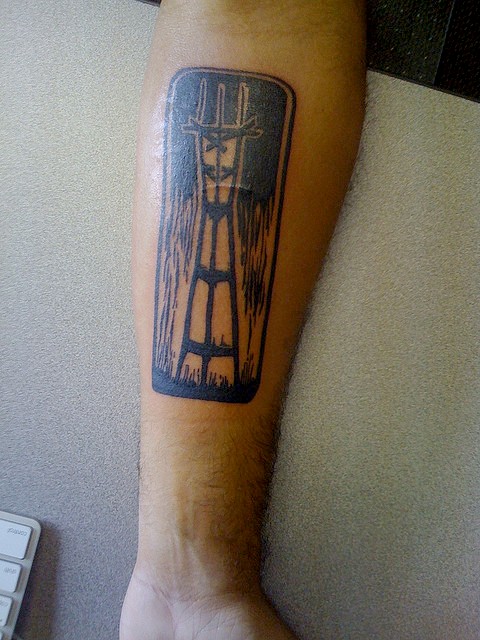 Chris R, whose tattoo appear in this photograph on Flickr, explains: “A tribute to my dad who died back in 1990. He lived here in SF, so I’d always come to visit on weekends and such. He played around with wood block printing as a hobby, and Sutro tower was always a significant landmark for me, so the design just seemed to fit.” Chris found the image on the craft-site Etsy, but couldn’t recall the artist. Only afterward did he discover the original artist, Eric Rewitzer of 3 Fish Studio, who was honored that his work was so memorialized. (See the comment-stream after the photograph.)